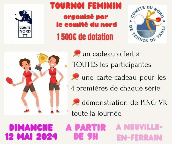 Le Comité du Nord de Tennis de Table organise le 12 Mai son tournoi féminin de tennis de table à Neuville en Ferrain ouvert à toutes