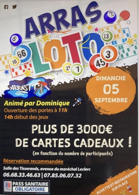 🏓 Info Arras TT 🏓 le 5 septembre 2021, Arras TT organise un Loto ! Venez nombreux !